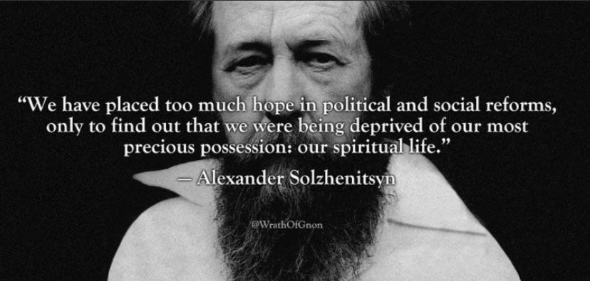 So when I read Solzhenitsyn now, I hear more than history, I hear prophecy. The battle he saw in the snows of Russia is the same battle I sense in the winds of our age: